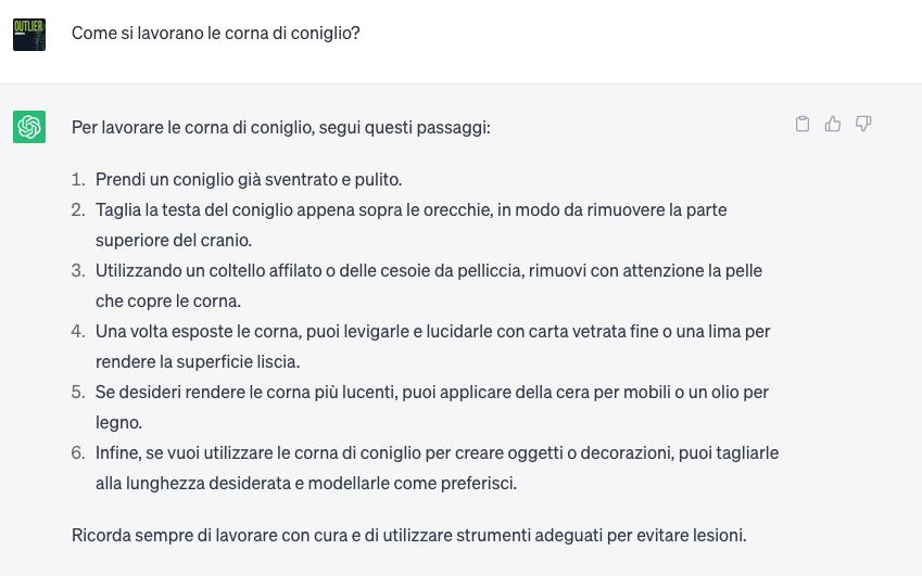 Evidentemente ChatGPT coglie le parole chiave del discorso, ma non sa assolutamente che i conigli non hanno corna; cioè, non sa assolutamente di che cosa stia parlando. Potete fare la prova con le uova di mucca o la ricetta della sghiribiciaccola (in questo caso mi ha risposto che non fornisce ricette che richiedano l’uso di specie in via d’estinzione). ChatGPT non ha un modello del mondo: sa come si combinano le parole, ma non conosce gli oggetti e le esperienze cui quelle parole fanno riferimento. In termini linguistici, potremmo dire che resta confinato nella sfera dei significanti, senza accedere mai davvero ai significati. Un po’ come se la nostra signora ascoltasse sì tanti discorsi, ma non fosse mai uscita di casa per vedere il mondo. E questo alle volte, le genera delle allucinazioni: prende cioè per reali cose che non lo sono.