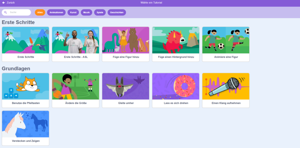 Der beste Weg, blockbasiertes Programmieren zu verstehen, ist es selbst auszuprobieren. Scratch bietet direkt in der Plattform eine Reihe von geführten Tutorials, die dich Schritt für Schritt durch verschiedene Projekte leiten von einfachen Animationen bis zu interaktiven Spielen.