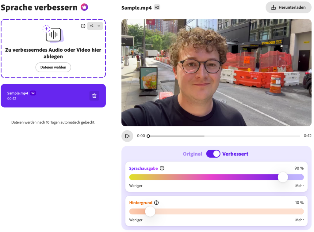 Mit der browserbasierten Software Adobe Podcast lassen sich Audiospuren mit Hilfe von künstlicher Intelligenz verbessern, wie zum Beispiel Hintergrundrauschen entfernen oder Podcasts aufnehmen.