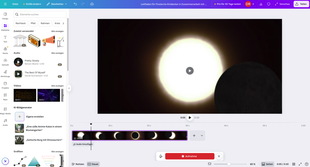Mit der webbasierten Plattform Canva kannst du visuelle Inhalte, wie zum Beispiel Videos, Flyers oder Präsentationen gestalten teilen. Canva beinhaltet Vorlagen von Bildern, Schriftarten und Grafikelementen. Die eingeschränkte Nutzung ist kostenlos.