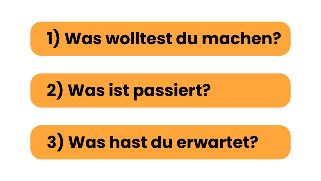 - Bei der Analyse eines Problems sind die drei Fragen «Was wolltest du machen?», «Was ist passiert?» und «Was hast du erwartet?» wichtig. Versuche diese Fragen zuerst zu beantworten.