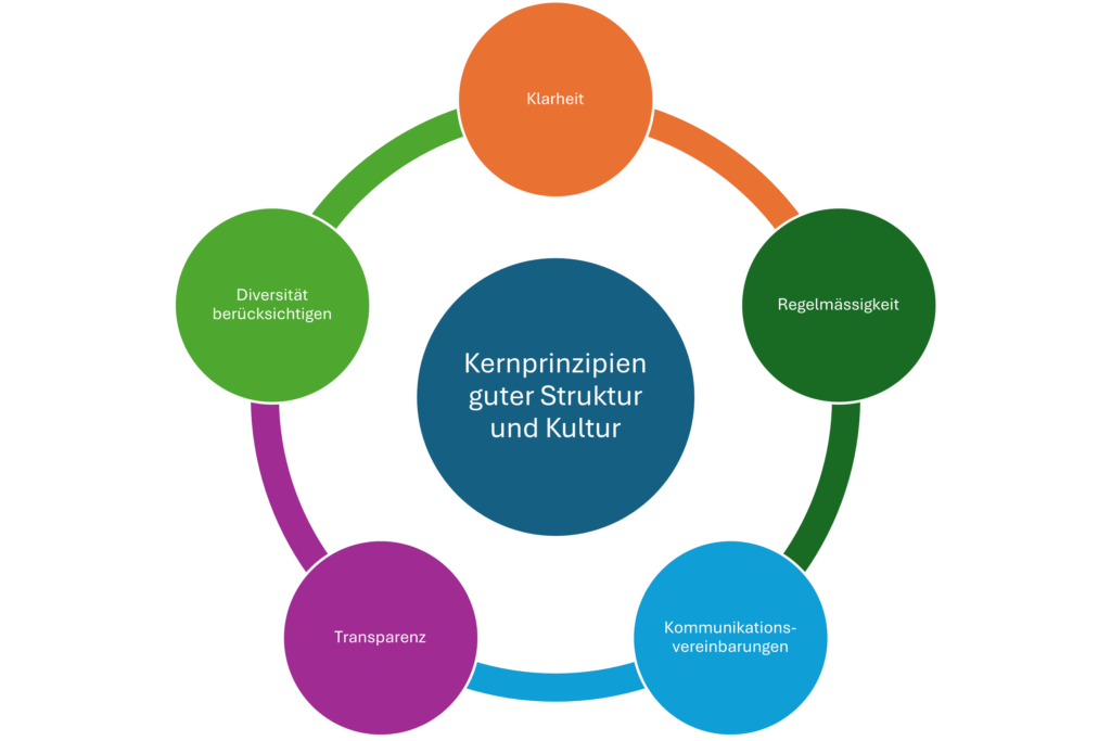 Damit Strukturen und Kultur gemeinsam wirksam werden, ist eine bewusste, konsistente Umsetzung notwendig. Folgende Gestaltungsprinzipien helfen dabei, ohne den Charakter eines digitalen Kurses zu stark zu regulieren:
